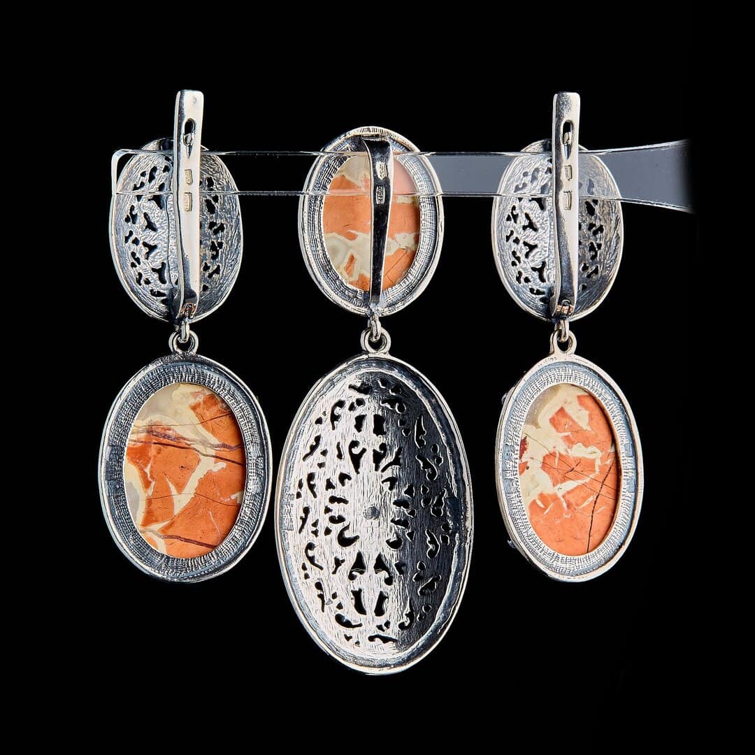 A rare vintage set that even now looks stylish and relevant.Beautiful vintage silver drop earrings and pendant with jasper insert and openwork silver enamel.