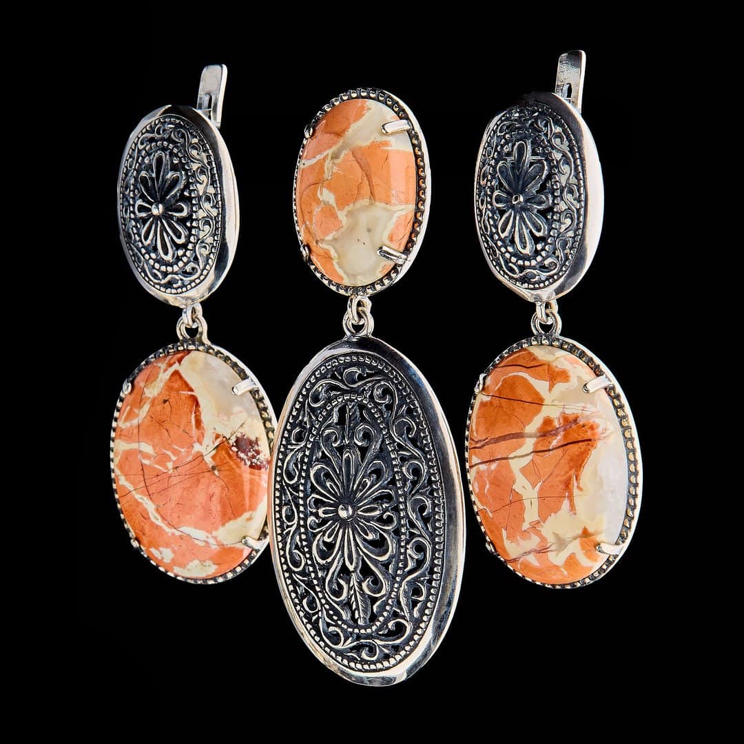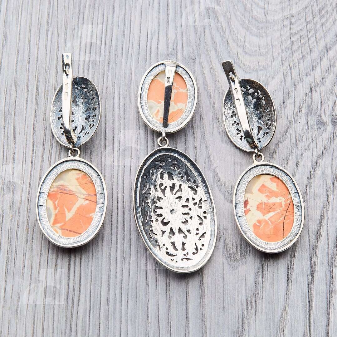 Rare vintage 925 silver set: drop earrings and pendant with jasper. Earrings with precious stones. A unique gift.