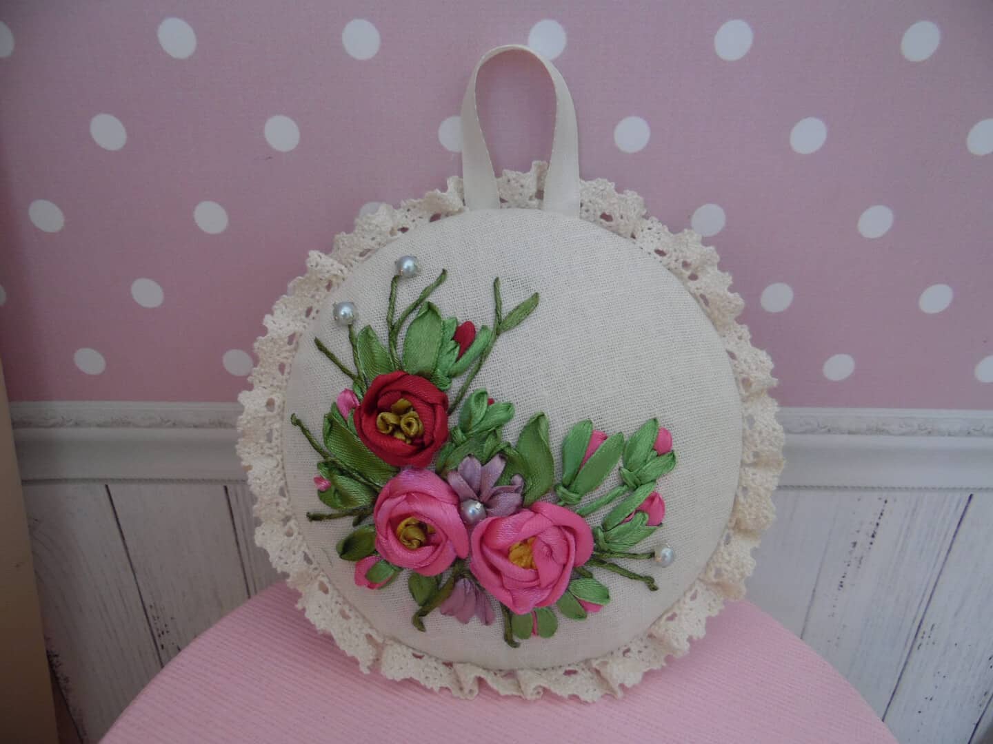 Ribbon Embroidery Pin Cushion Embroidery Deep Red Marooned Rose Shabby Home Decor Linen pillow with lace trim Wall decor