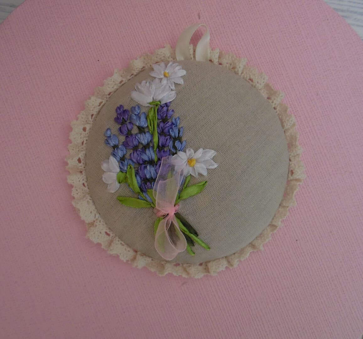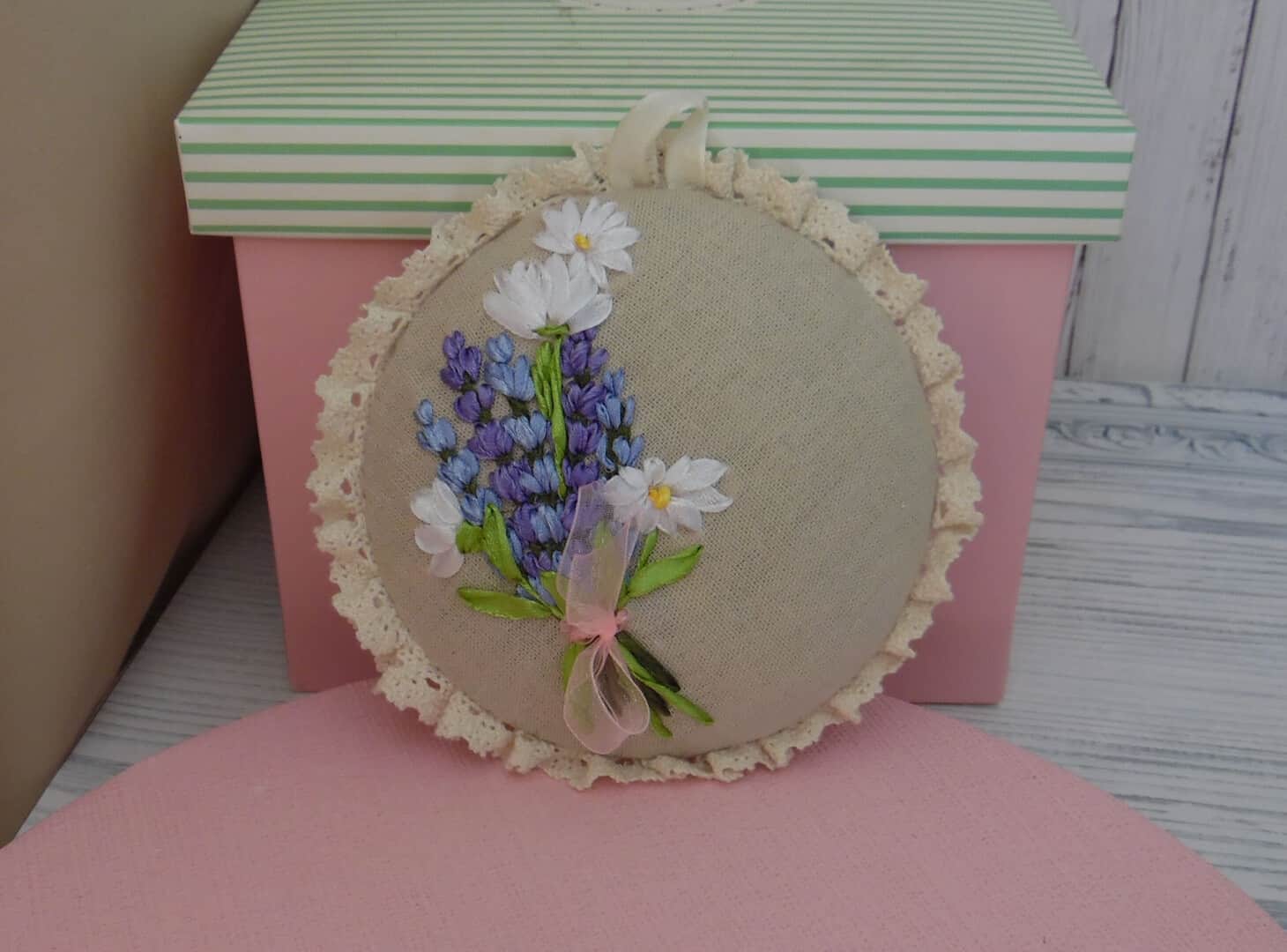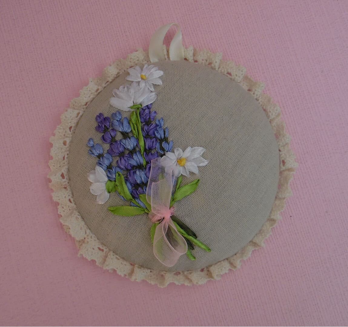 Ribbon Embroidery Pin Cushion Embroidery Lavender and Camomiles Provence Shabby Home Decor Linen pillow with lace trim Wall decor