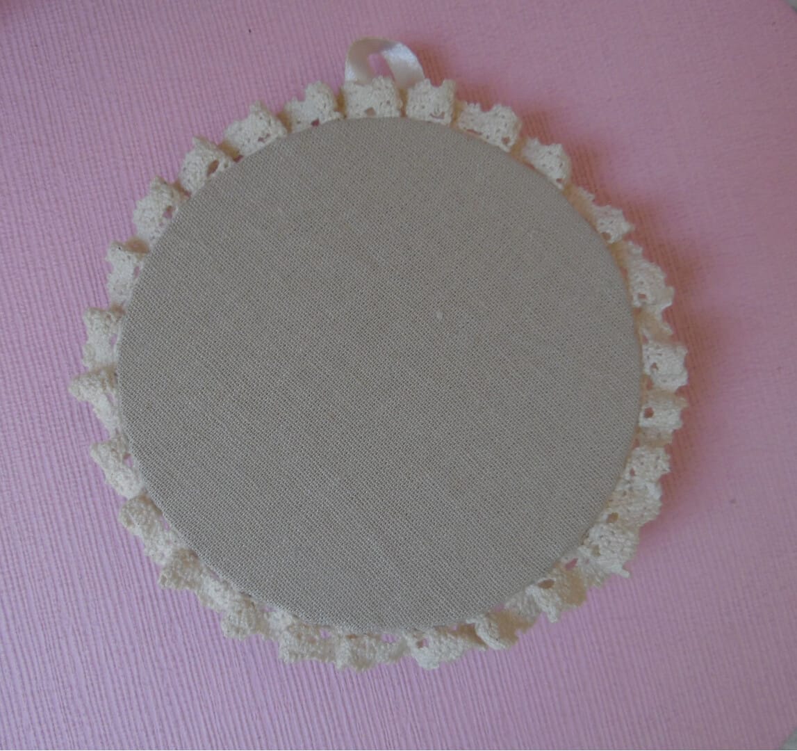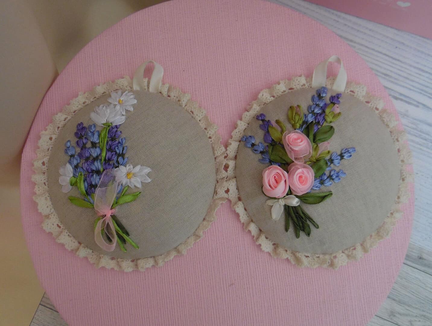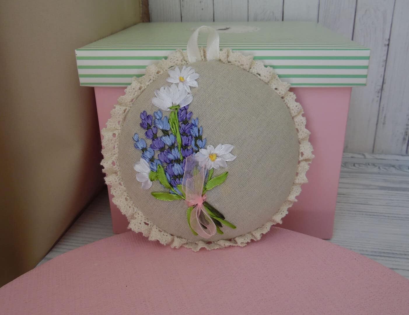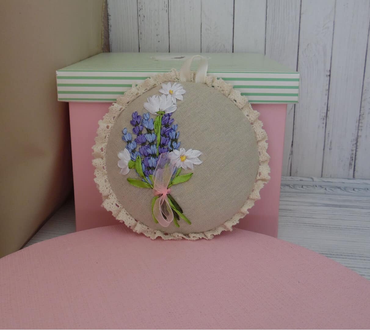 Ribbon Embroidery Pin Cushion Embroidery Lavender and Camomiles Provence Shabby Home Decor Linen pillow with lace trim Wall decor