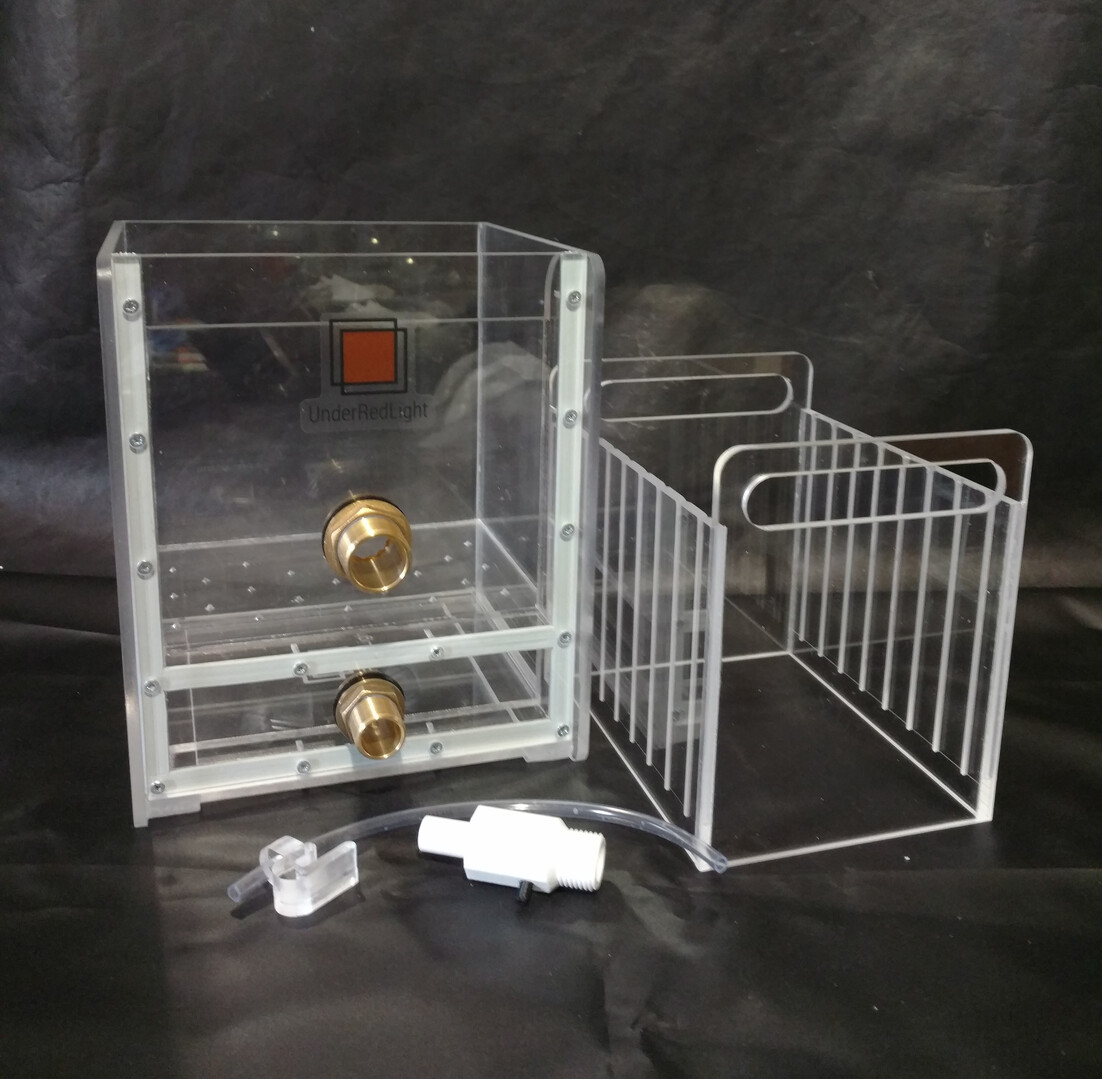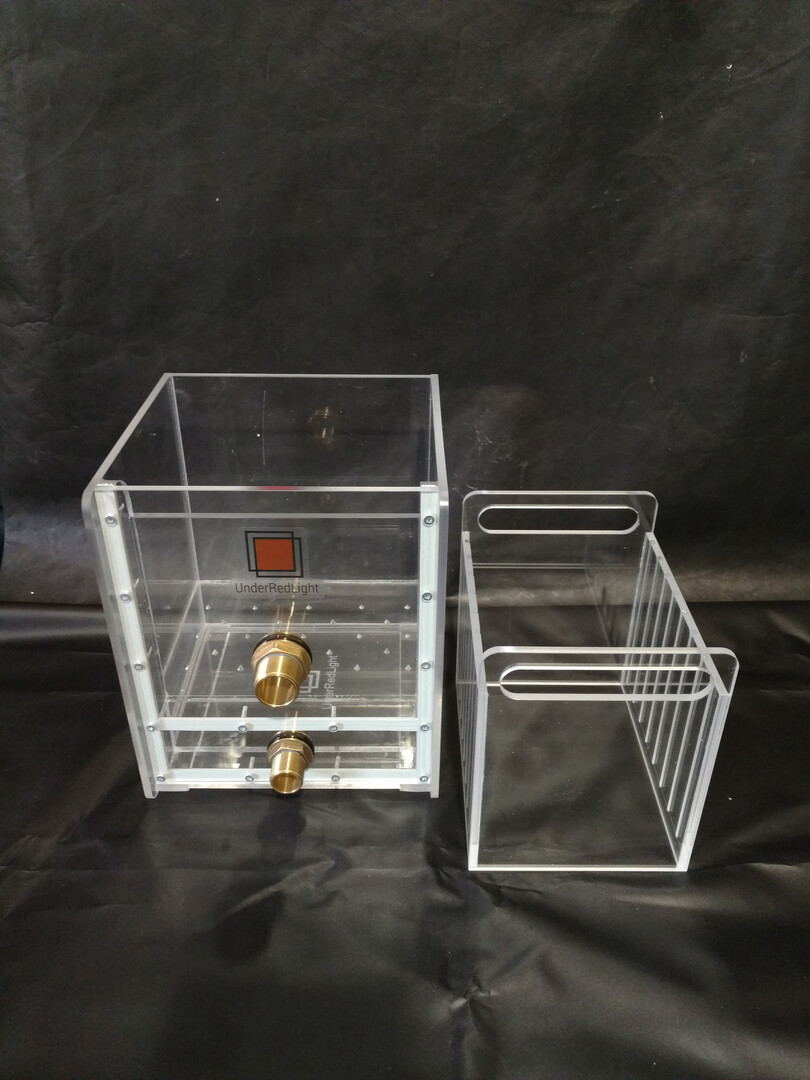 Wet plates washer. Device can process 12 plates 8x10"  or up to 24 plates 5x7/4x5". Features: - Inlet and outlet brass connectors have inch threads (1/2", 3/4"); - Supplied with basket container ; - Plates are placed slightly tilted into container to avoid knocking them over into the washer and emulsion damage.  - Basket has divider for smaller plate formats. ===============  Important notifications!  ================ Production and times Every washer will be created to order.  There are no ready to ship items, therefore keep in mind that producing takes time.  As regular it takes from week to two from material ordering to ready to ship device. Also other orders can be in line when you make your own order and third party delays also happen. In additional these days due to known actions on my land some extra delays may happen. As a rule I notify buyer about production time in message after order. If you worries about times, please ask about it before buying! Washers made of acrylic. Due to manual manufacturing devices may contain marks: small scratches, glue marks on surfaces and bubbles into the glue lines. However it is doesn't take effect on functionality, common look and doesn't limit owners to be satisfied with device. Be sure that each washer I produce with due care and attention. Design may be slightly differ from the sample view on the photographs due to time to time modernisation. Shipping & delivery: It is possible to send goods mostly worldwide with range of services.  Shipping prices are actual mostly for United States. Shipping cost for consumers outside US specified approximately and may differ. Please clarify about delivery cost for your county before ordering. Due to international sale some customs and import taxes may apply to buyers depending on location. All devices are packed well in several package layers, however Please check your parcel at least visually when you will receiving it. In case the box is damaged or looks bad open it with courier to check goods. It may let me and you to get refund if device will be damaged on the way. ========== Options: You can ask to create almost any custom washer or tray for films and prints with necessary holding capacity, additional modules (such as module for Hypo clear solution) and format (up to 20x24" and more). Find more interesting on my Instagram:  underredlight