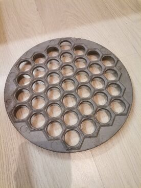 On offer here is a lovely Soviet-made mold for the preparation of vareniki, cooking can be interesting and easy! You will get very very tasty home meat vareniki with minimal effort. Stamped with the CCCP Soviet quality mark, this Vareniki mold is simple in use - even your child can join the fun in making tasty vareniki. It makes 28 vareniki at a time. This utensil is in great shape... suitable for modern usage. Discover the charm of these kitchen tools of days gone by, and it's much better than the cheap plastic version from China which only makes 7 at a time! Aluminum cast form.   Dimensions: Diameter Mold: 27 cm./ 10,62 in Diameter vareniki: 6.3 cm./ 2.48 in Weight: 722 gram   Good condition! Rare and original soviet collectible items. Nice and rare item for your collection. Wonderful gift for friends or just for someone you love. Legendary Soviet quality.   ATTENTION: Dear Customers, you will receive exactly the same item which you see on the pictures, not similar or other. Please review the photo. Please feel free to ask me if you have any question. Please see my other items, and email if you need combined shipping. Every week I add new items.   LOOK MY OTHERS ITEMS FROM SOVIET! Successful purchases and sales !!!