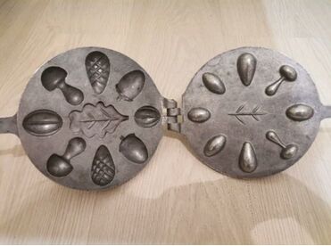 A famous Soviet cookie mold for baking sweet cookies. The sweet treat which any Soviet kid craved for! Bulk baking of different cookie shapes: Nuts (oreshki), mushrooms (gribochki), fir-cones (shishki). The filling depends on your fantasy: boiled condensed milk, chocolate, jam, curds, nuts, cream, honey etc. After baking the cookie halves are filled with the filling, stuck together and are ready to be served.   Good vintage condition! Rare and original soviet collectible items. Nice and rare item for your collection. Wonderful gift for friends or just for someone you love. Legendary Soviet quality.   Shiping worldwide! It will be send with Tracking number! ATTENTION: Dear Customers, you will receive exactly the same item which you see on the pictures, not similar or other. Please review the photo. Please feel free to ask me if you have any question. Please see my other items, and email if you need combined shipping. Every week I add new items.   LOOK MY OTHERS ITEMS FROM SOVIET! Successful purchases and sales !!!