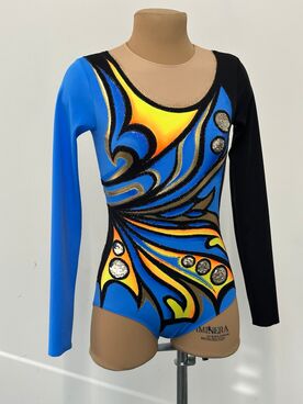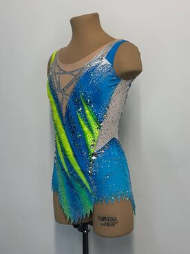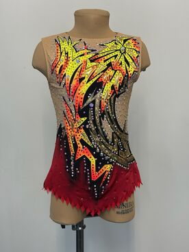 Rhythmic Gymnastics Leotards RGL_202301 ”Colorful Life” combines a bright bi-elastic supplex fabric – polyamide with the addition of elastane and a beige mesh or fabric to simulate a naked body. Production of materials Italy, England. The fabric stretches well, does not hinder movement. The colors are bright and saturated. To give the effect of volume, 2D and 3D applications were used, as well as additional hand-painted details