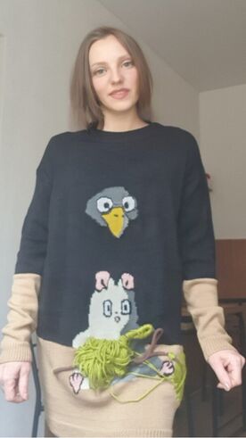 Oversized sweater knitted in intarsia technique on a 5th grade knitting machine from Italian merino, soft, thin for spring. Sweater pattern based on the Japanese anime by Miyazaki Hayao. size: L (70x54cm) composition: merino wool weight 400 g