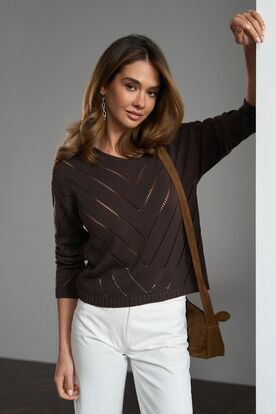 Delicate sweater made of cotton yarn. Soft, pleasant to the body, stretches well. Straight silhouette. Comfortable dropped shoulder line. At the bottom of the product and on the sleeves - elastic cuffs. The sweater is decorated with an elegant pattern. Length 56 cm (+- 2 cm). Width in a calm unstretched state 49-54 cm., in a stretched state 55-60 cm. Shoulder width 17-19 cm. Sleeve length 51-52 cm. Sleeve width at the bottom 9-10 cm. Cuff height 3 cm. Neck depth 15-16 cm. size: 42-46 composition: cotton 80%, viscose 20%. colors: chocolate, coral, lemon, milk