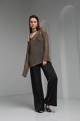 https://drive.google.com/file/... Fancy openwork jumper made of viscose yarn. The thread is of medium thickness, textured and quite soft to the touch. Due to nylon and polyester, it has a glossy sheen. It is easy to drape, "falls" beautifully. Easy to care for, has a high level of durability and stability. The jumper is made in a stable translucent weave. Length about 63 cm (+- 2 cm). Width in a calm unstretched state 47-52 cm Width in a stretched state 51-56 cm. Sleeve length 48-50 cm. Shoulder width 14-15 cm. Sleeve width at the bottom 13-14 cm. Neck depth 12 cm. size: 42-46 composition: 58% - VISCOSE 35% - POLYESTER 7% - NYLON