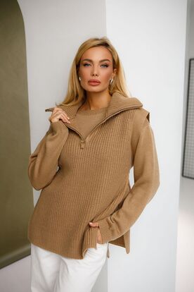 Stylish vest with side slits made of pleasant soft half-woolen yarn. The vest is made of dense elastic weave with a vertical pattern. It has a high stand-up collar with a zipper, which can be worn in different variations. The shoulder cuts are edged with inserts that turn into a decorative and functional belt to fix the waist line. Length about 68 cm (+- 2 cm). Width in a calm unstretched state 51 cm. Shoulder width (including the bar) 14 cm. Collar height 16 cm. Zipper length 28 cm. size: 42-52 composition: 40% - WOOL 25% - VISCOSE 20% - ACRYLIC-SOFT 15% - POLYAMIDE