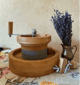 Hand grain mills have several advantages: Eco-friendliness and Cost-effectiveness: They don't require electricity, making them more eco-friendly and cost-effective to use. Quality Control: You can control the coarseness of the grind, choosing how fine the grain will be, and be sure of the product's quality, as you know the source of the flour. Nutrient Preservation: The slow grinding process retains more nutrients in the grain, unlike high-speed industrial mills that can heat the grain and destroy vitamins and minerals. Durability: With proper care, hand mills last a long time, don't rely on technological advancements, and don't require the replacement of complex parts. Versatility: They can be used to grind various types of grains and spices, making them useful in household settings. Physical Activity: Using a hand mill requires physical effort, which can be beneficial for maintaining physical fitness. These advantages make hand grain mills a great choice for those who value the quality and naturalness of their food products. Equipment: Mill - 1 piece clamps for fastening - 2 pcs. Weight: 5.5 kg Height: 20 cm without handle Diameter of surface space: 30 cm Funnel capacity: 300 g Milling capacity fine: 40 g/min Millin g capacity coarse: 80 g/min Diameter of mill-stone: 15 cm Mill-stone: granite