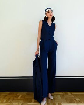 Description: -Fabric: crepe diagonal ( cotton 65%, polyester 35 %). -The length of the jacket is 74 cm (29.9 inches). -The length of the sleeve is 60 cm (23.6 inches). -The length of the pants is 115 cm (45.4 inches). -Inseam length of the pants is 88 cm ( 34.6 inches) -The length of the back vest is 43 cm (16.9 inches). -Double Breasted Blazer with lined| Lined Vest | High Waisted Pants -Color:dark blue, gray -If necessary, we sew the color -black, red, pink, white, dark blue, light beige. *write for us and we will send more photo .