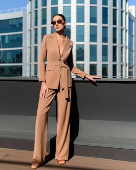 Elegant Women Pantsuit, Caramel Wedding Guest Suit, Prom Suit with Belt, Dark Beige Women Pants with Single Breast Blazer An elegant pantsuit with a straight silhouette, featuring a belted blazer and wide-leg trousers. The blazer, with a classic collar and deep neckline, accentuates the waist with its statement belt. The wide-leg trousers add a touch of sophistication and ease to the look. This suit is perfect for both formal events and chic evening outings Model "Liam" Description: -Fabric: crepe diagonal ( cotton 65%, polyester 35 %). -Blazer with lining -Blazer length: 70 cm (27.6 inches) -Sleeve length: 63 cm (24.8 inches) -Trousers length (inseam): 91 cm (35.8 inches) -Colors: caramel   -If necessary, we sew the color - navy blue , black, red, tiffany, raspberry ,white   *write for us and we will send more photo .