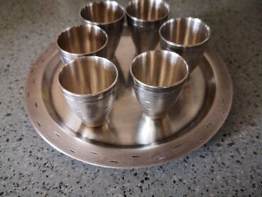 I present to your attention an exquisite vintage set made of cupronickel, consisting of an elegant tray and six glasses. This set is the embodiment of sophisticated style and noble classics, which will decorate your table or make a wonderful gift for those who appreciate antiques. Set Features: Material: Cupronickel (an alloy known for its durability and exquisite shine) Elegant design with a sophisticated pattern Suitable for serving strong drinks Excellent condition Such a set will perfectly complement the interior in retro style, create an atmosphere of comfort and become a real highlight of your collection. Shipping to your city. If you are interested in this offer, write in private messages!
