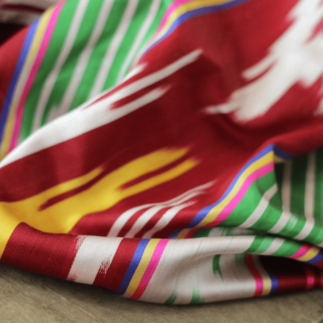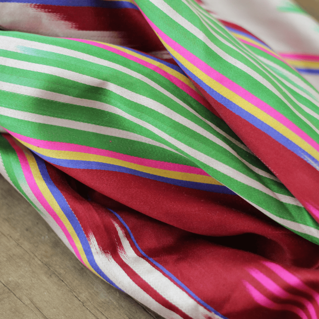 This silk was hand woven in Margilan, Ferghana Valley, in Soviet Union times. This heavy silk is smooth and cool to the touch. It is handwoven fabric, made in the ancient way on primitive looms. The pattern is not printed; instead, threads are dyed in sections according to complex calculations. The fabric is 100% natural silk as evidenced by the care tag. It is called khan atlas.