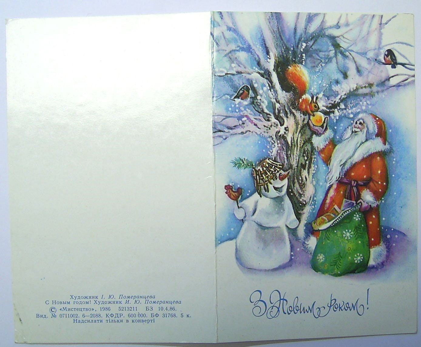 Postcard with Santa Claus and Snowman - artist I. Pomerantseva. Postcard released in 1986. Dimensions: 9x14.2 cm (3.54x5.59 inch).
