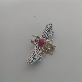 brooch in white gold 14 k with diamonds 0,010 carats. ruby cabochon and pear beryl. in the eyes of a ruby . 6 grams