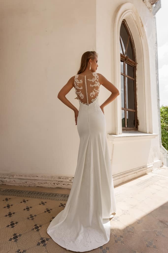 Spectacular mermaid wedding dress with lace. Open lace back. European loop. Cups are sewn inside the dress. Back with buttons.