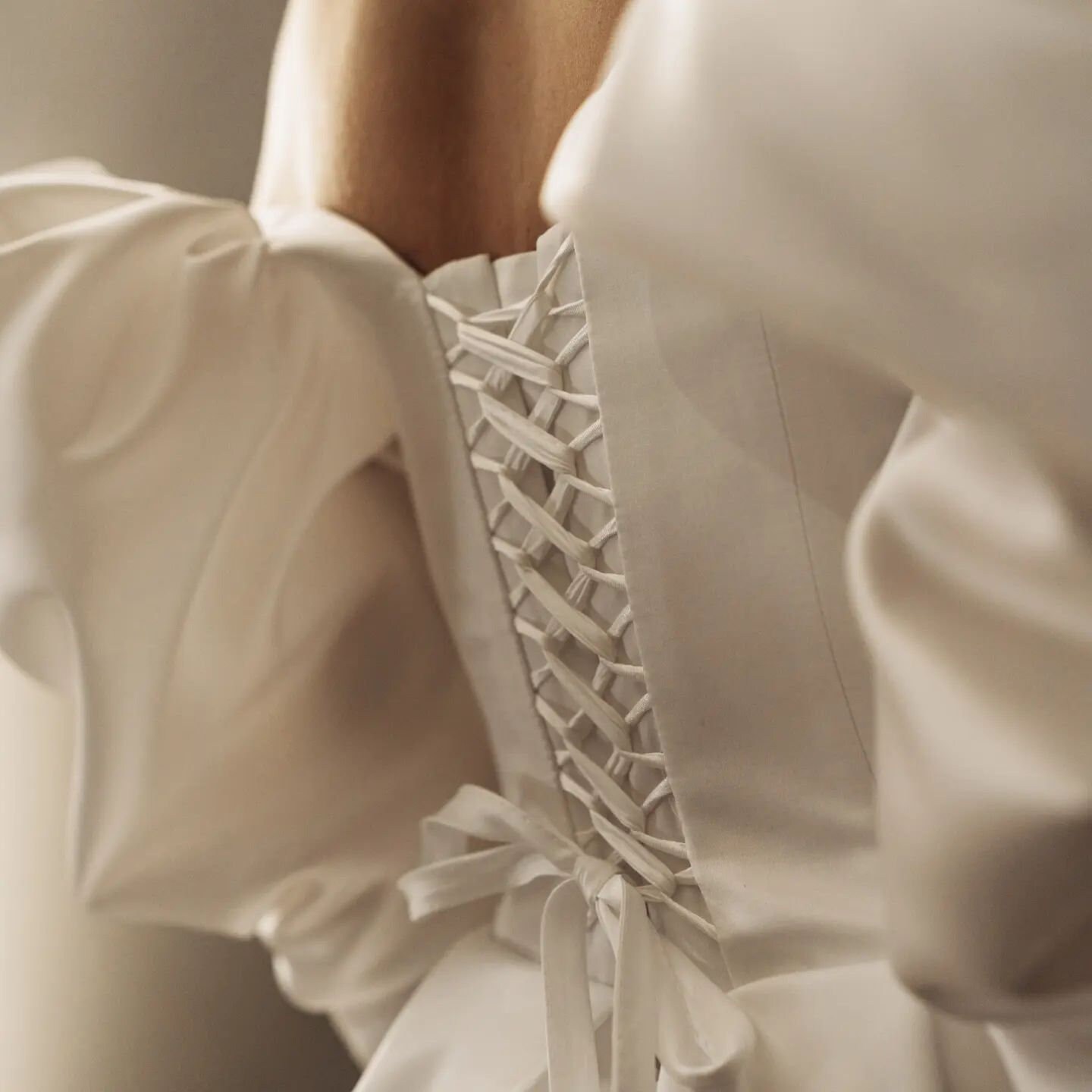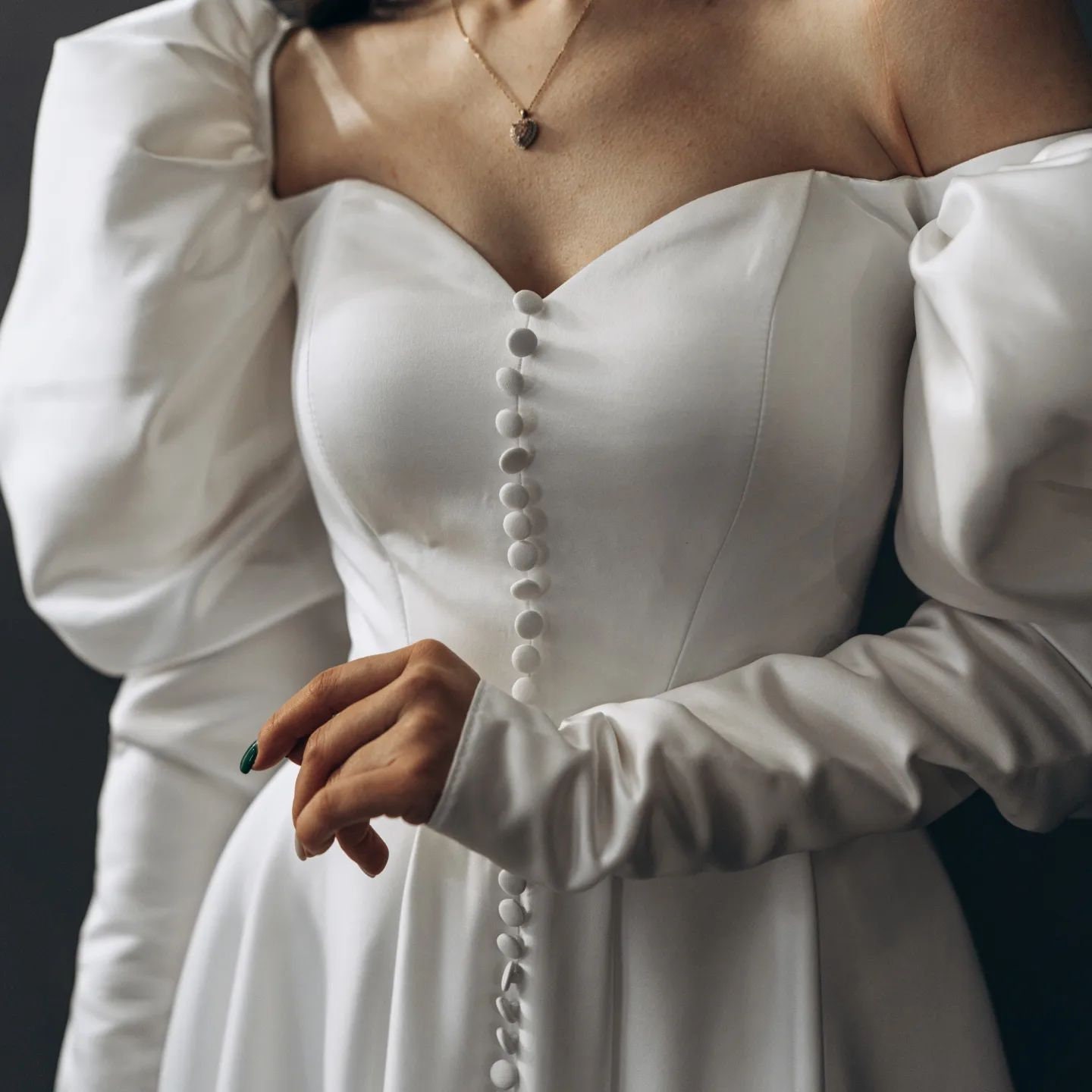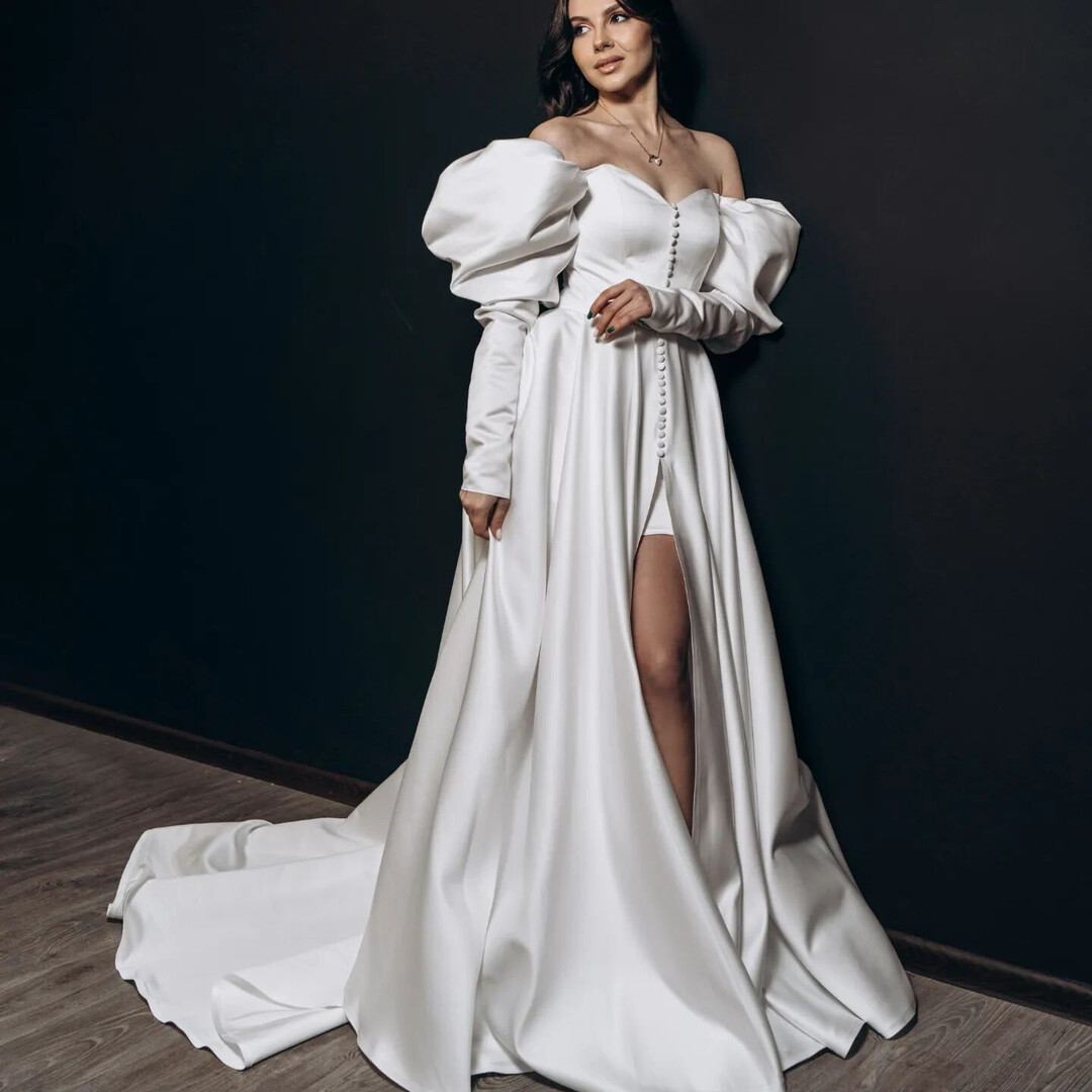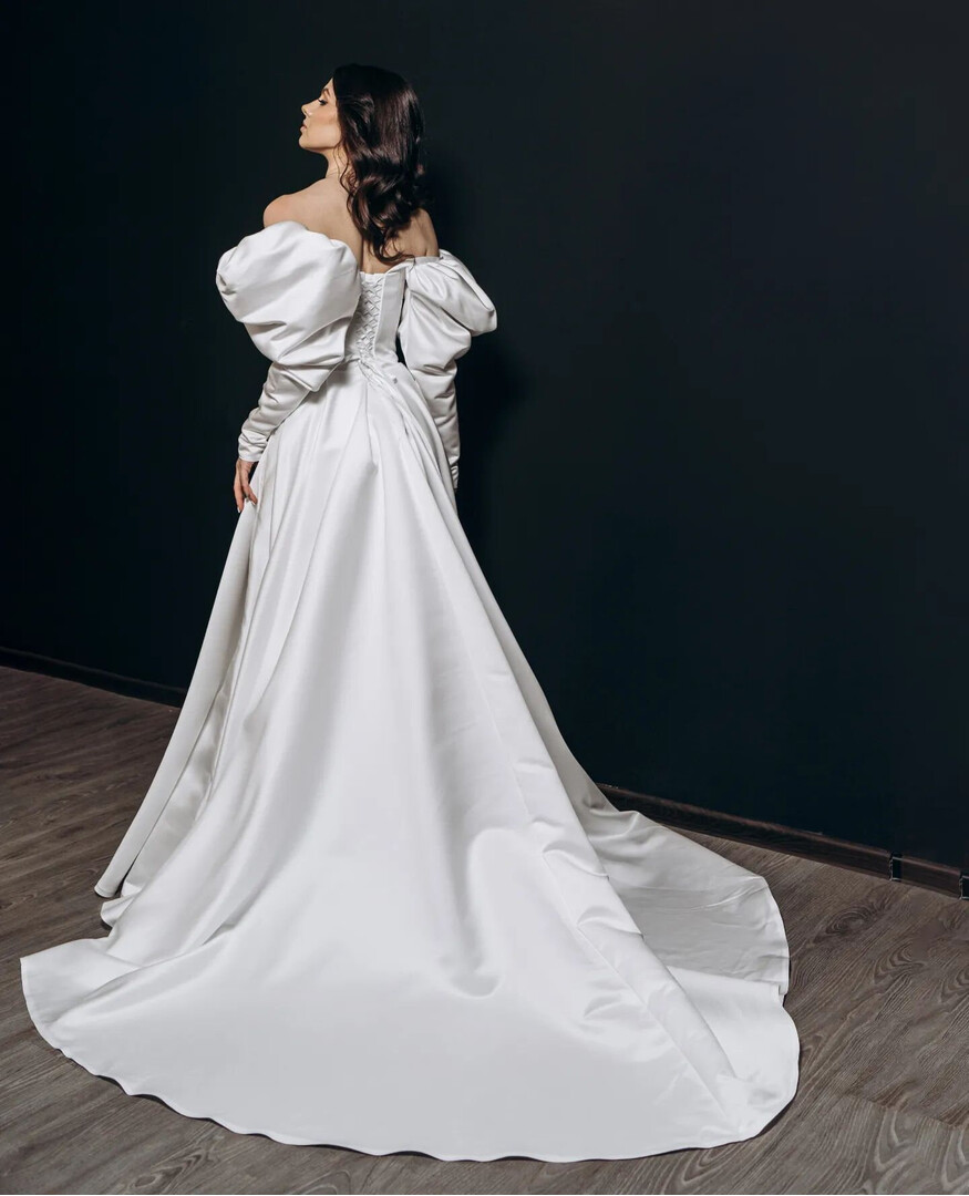Classic Off Shoulder Satin Wedding Dress, Long Puff Sleeve Bridal Dress, Wedding Ceremony Wear, Evening Prom Dress, Custom Made Dresses
