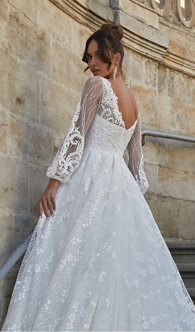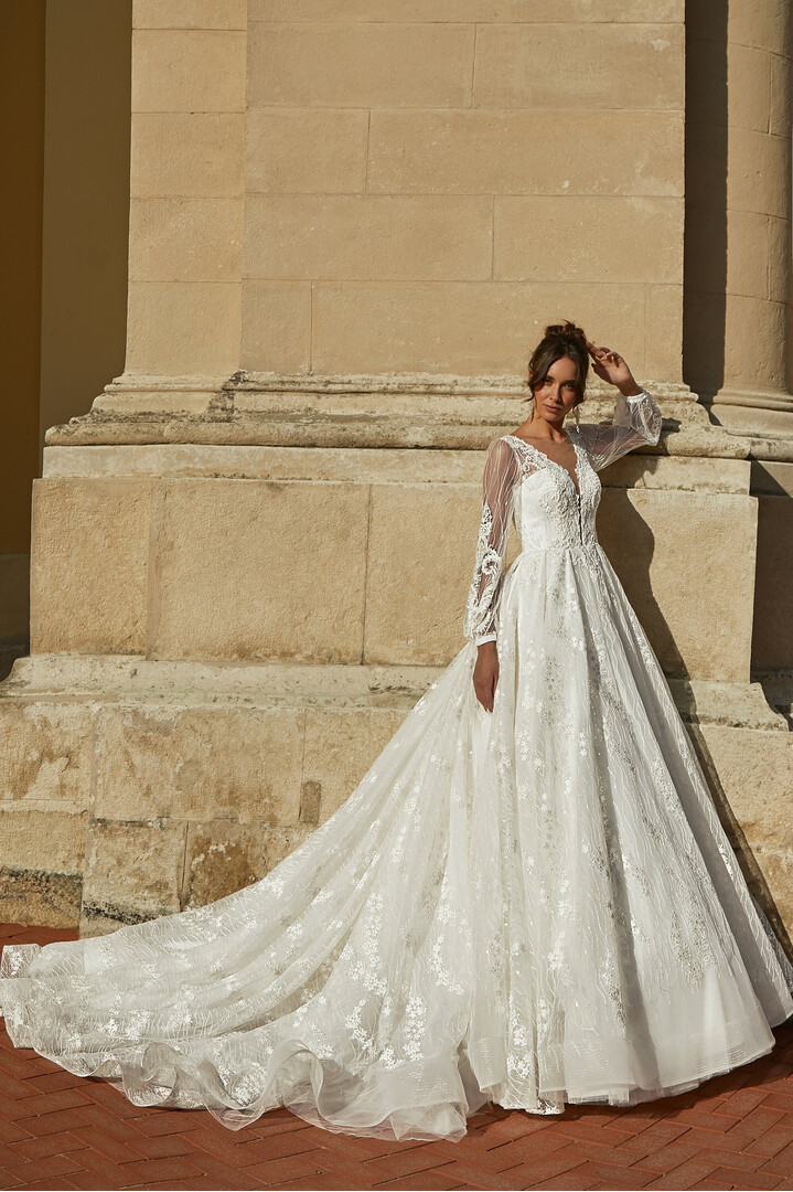 Elegant Classic Long Sleeve Wedding Dress, A Line Bridal Gown with Long Train, V Neck Ceremonial Lace Wedding Dress, Individual tailoring