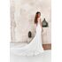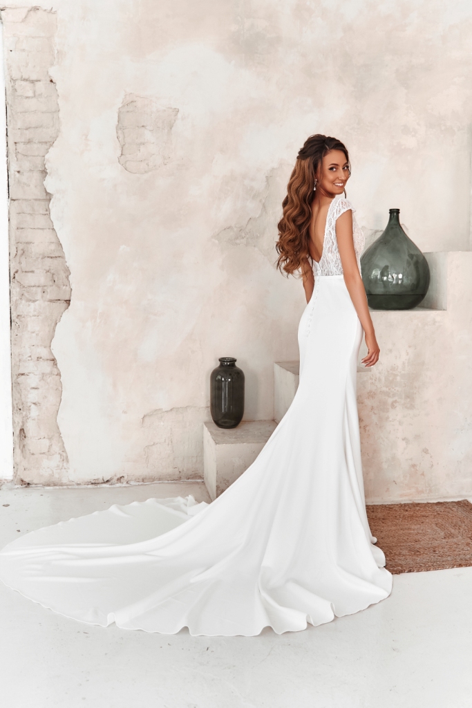 Wedding dress with a luxurious train. Open back. Spectacular V-shaped neckline. Beautiful lace on the corset. The cups are sewn inside the dress.