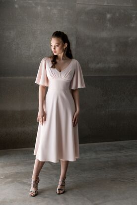 This dress is ideal for bridesmaids, formal gatherings, or any special occasion where understated elegance is desired. Its minimalist yet graceful design ensures a timeless look. The clean design emphasizes simplicity and elegance, making this dress versatile for a variety of occasions. The skirt flows smoothly from the defined waistline, creating a relaxed yet elegant silhouette that moves beautifully with the body. Unique butterfly sleeves provide a soft and romantic look, offering both coverage and a light, airy feel. Soft and flowy fabric, creates a lightweight and comfortable fit while offering a graceful drape.