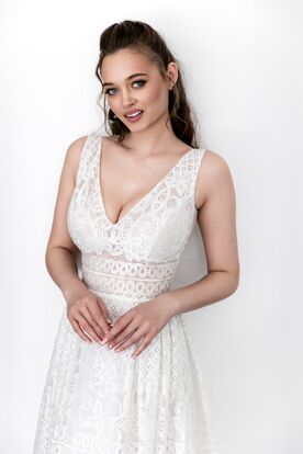 This dress is a stylish midi-length bridal outfit perfect for modern, chic brides. It features a V-neckline with wide straps that add a touch of elegance. The bodice is beautifully adorned with intricate lace patterns, showcasing a mix of geometric and floral designs. The skirt flows into a soft A-line silhouette, creating a flattering shape that balances femininity and grace. The lace detailing continues down the skirt, with eye-catching cut-out designs near the hemline, giving the dress an airy and light feel.