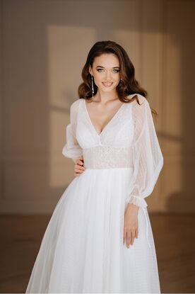 This enchanting midi-length wedding dress is the perfect combination of elegance and romance. The dress features a V-neckline and a fitted bodice with intricate lace detailing that adds texture and delicacy. The standout detail is the airy, sheer balloon sleeves made of dotted tulle, which gather at the wrists with charming ribbon ties, lending a whimsical, vintage-inspired touch. This dress is perfect for garden weddings, intimate ceremonies, or brides looking for a light, flowing ensemble with a bit of bohemian flair.
