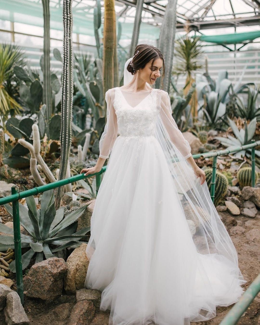 Rustic wedding dress, Bridal dress with long sleeves, Wedding dress with long tulle skirt and train, Custom made wedding dress, Evening Gown
