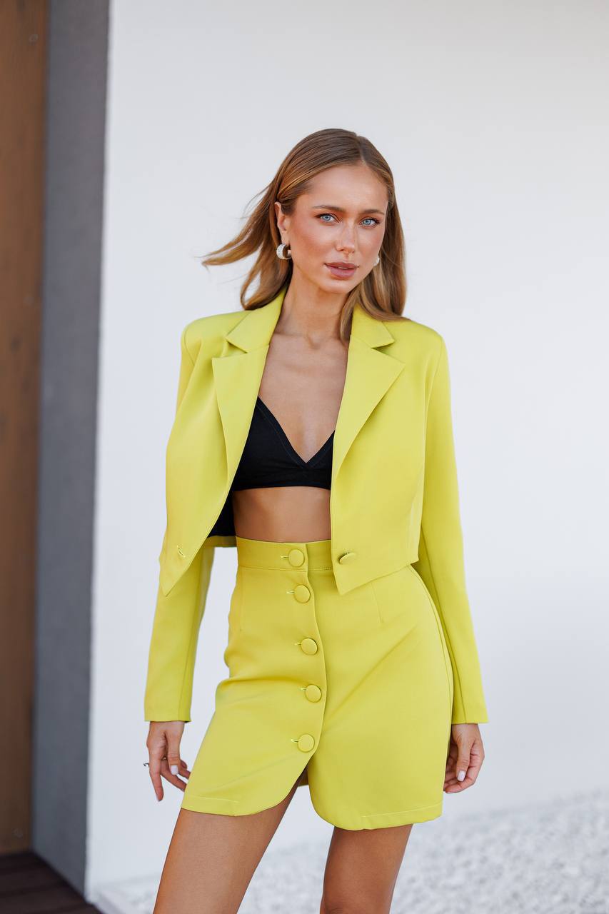 Sylish two-piece outfit combining two bold looks in one. The first set features a lime green blazer with a matching mini skirt, creating a chic and modern silhouette. The second set includes raspberry pink trousers with a matching crop top, perfect for making a statement. Together, these vibrant colors create a unique mix-and-match ensemble that works for parties, fashion events, or any special occasion.