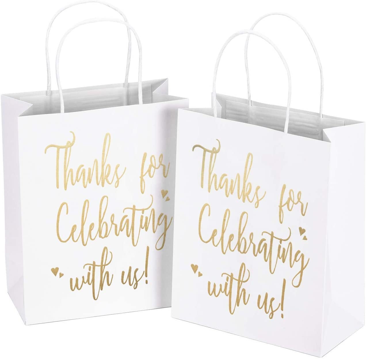Medium Size Gift Bags - Gold Foil"Thanks for Celebrating with us" White Paper Bags with Handles for Wedding, Birthday, Baby Shower, Party Fa