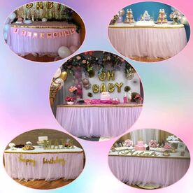 ● ????HIGH QUALITY TABLE SKIRT: Made of soft and comfortable tulle, come with pink blue Two Color Splice anti wrinkle lining cloth.Washable, natural drooping,wrinkle resistant,durable.Can be reused.● ???? TULLE TABLE SKIRT SIZE: Multicolor 9ft (L108in×H30in) covers front and two sides of a 4ft rectangle table 2.covers front and one side of a 6ft rectangle table 3.only covers front of an 8ft rectangle table.Please measure your table size before you buy it.Or email us to refer you to the appropriate size.● ????EASY TO SET UP: These Table Skirt come with hook and loop straps at the edges. Place a nylon button on the side of the table, then wrap the table skirt around the table, and finally stick the hook and ring together!● ????OCCASION:These rectangle table skirt perfect for any party occasion,such as wedding ,baby shower,1st birthday party,holiday parties,family gathering, Party & Home Decoration etc.● ????TIPS: Avoid sharp items or the tulle table skirt may be damaged .If you want it more soft and fluffy, just put it in the water, hang it out to dry, after use,you can machine wash and keep for next special occasion.
