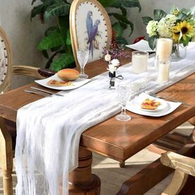 ● Material:100% chiffon,soft and wrinkle-resistant;● Size:Approx. 27''W x 120''L,10ft long;● Style:Add a touch of romance and glamour to your wedding or special events with our sheer table runners,it's silky and expertly made for a flowy look. Dress up your wedding reception tables, sweetheart table, and cake table etc. ,also provide gold ribbon ties for the option of gathering the soft folds of each end.● Reusable & Multi-use: Perfect for wedding,bridal shower,baby girl shower, party, romantic candlelight dinner,holiday/birthday/tea party,valentine date,special events and daily use.● Wash care Instructions: It's best to hand wash or machine wash in the gentle cycle with laundry bag.