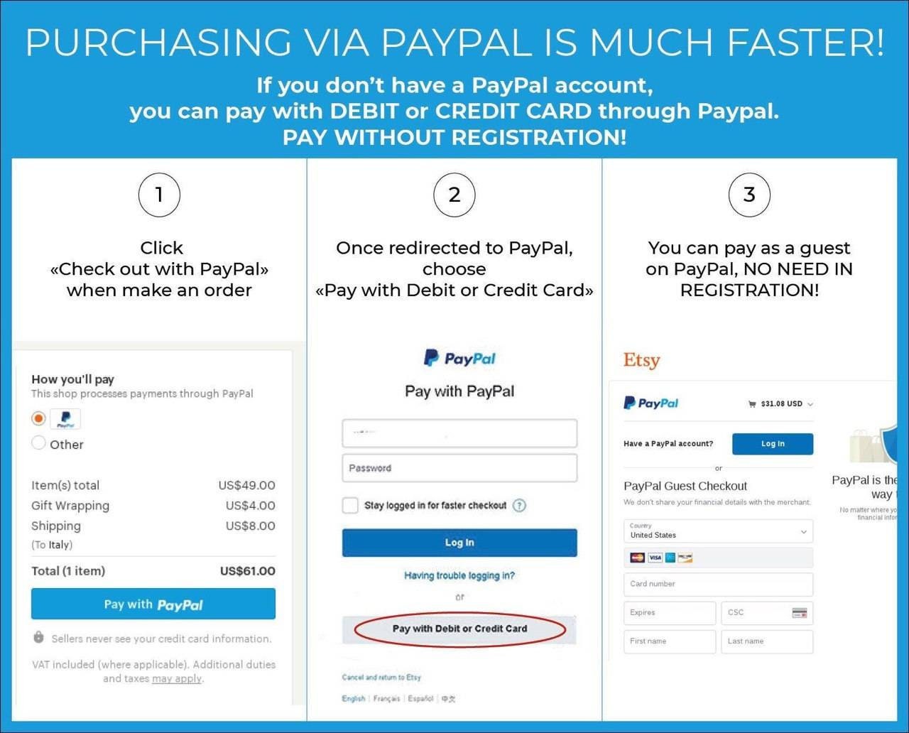 • If you don't have Paypal account and would like to pay with your Credit Card, check this step-by-step tutorial on PayPal: