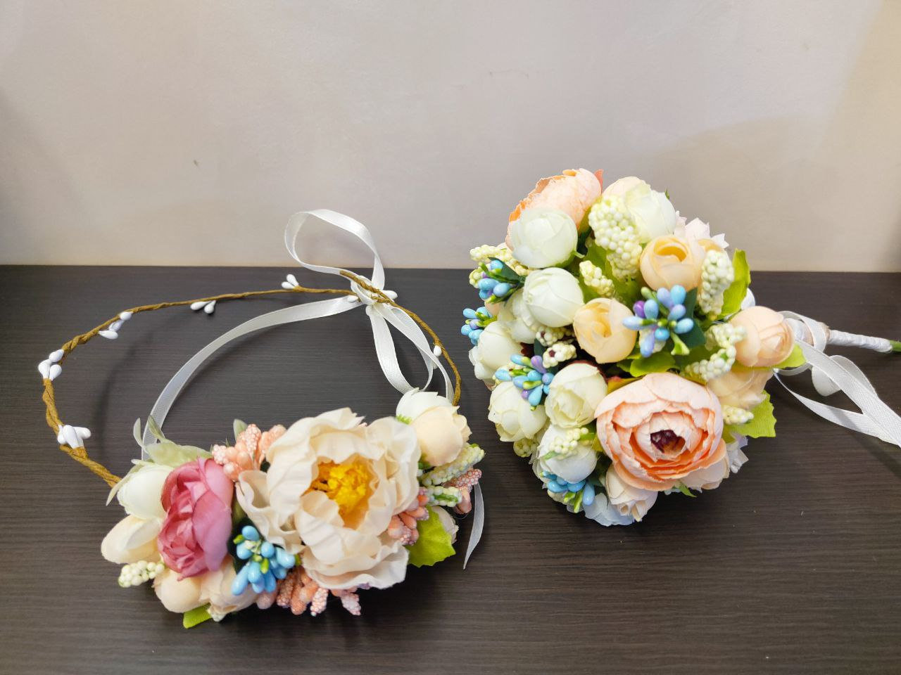 bridal wreath and bridal bouquet set,floral holiday motifs,warm wedding,faux flower bouquet