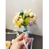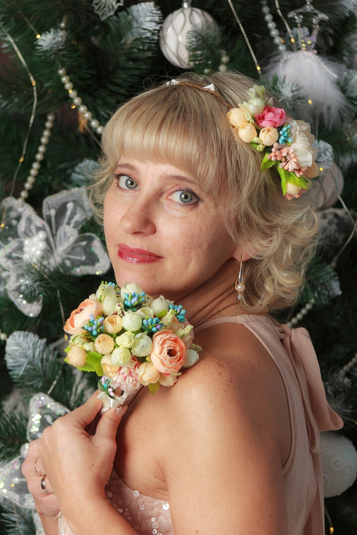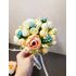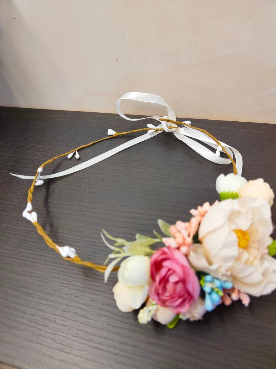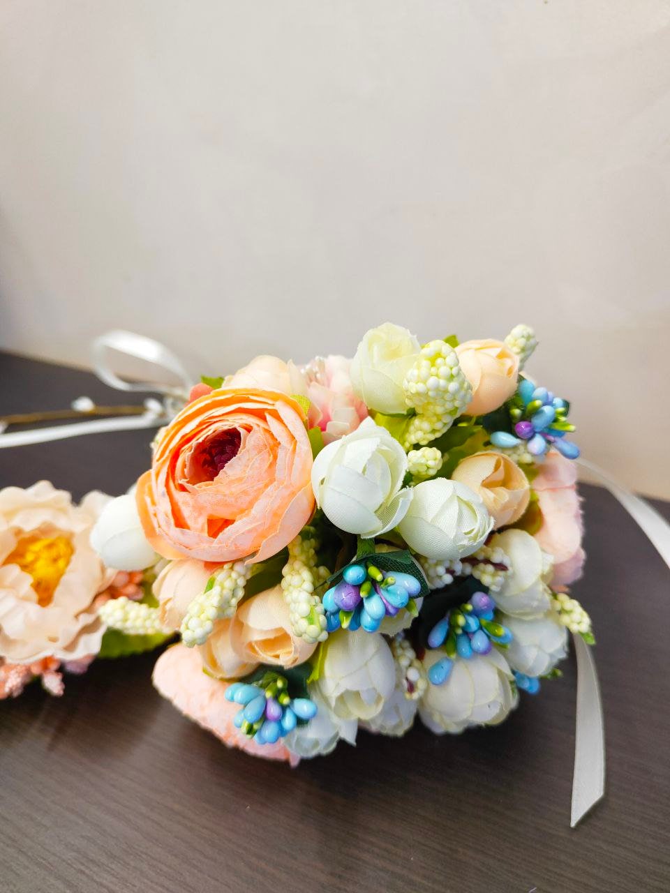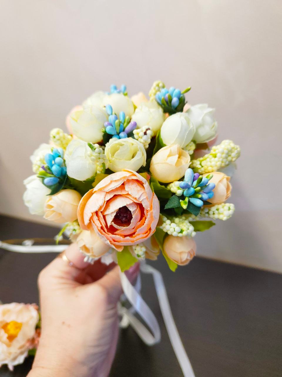 Harmonious composition wreath and bouquet for the bride of any age in delicate colors. Delicate set for wedding, graduation will decorate the girl and give harmony to the image. Made of artificial flowers peony, ranunculus, rosebuds, blue stamens. The wreath is adjustable, the length of the bouquet is 9 inches/ 23cm, the hat is 4.7 inches/ 12cm in diameter.
