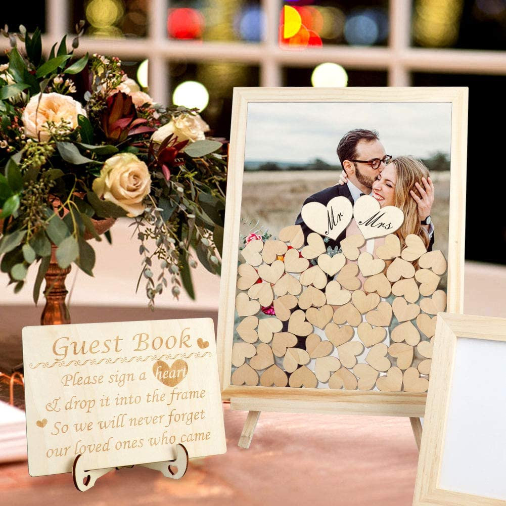 Wedding Guest Book Alternative, Wooden Picture Frame Drop Top Frame Guest Book with 80 Blank Hearts, Wooden Frame for Anniversary Bab